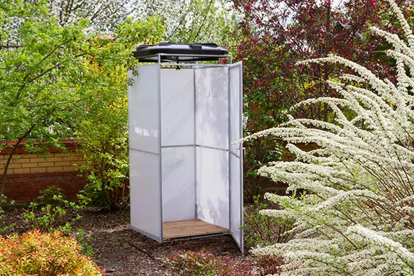 Садовый душ «Чистотел» с подогревом изготовлен из оцинкованных стальных труб, стойких к коррозии. Покрытие – непрозрачный сотовый поликарбонат. Конструкция легко собирается и устанавливается в грунт на любом ровном месте дачного участке. Каркас душа не нужно разбирать на зиму, а покрытие демонтировать.