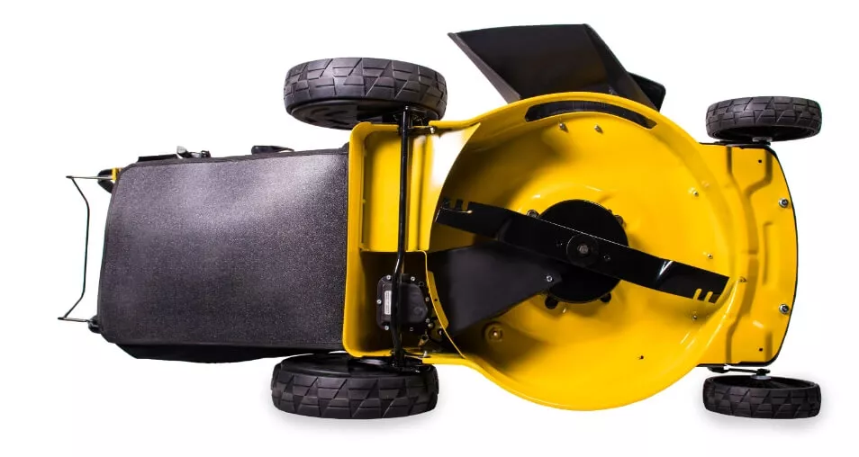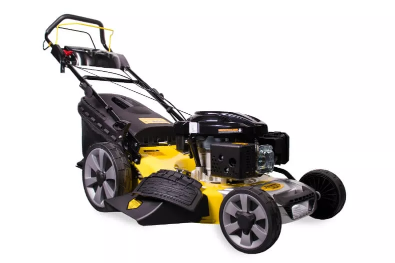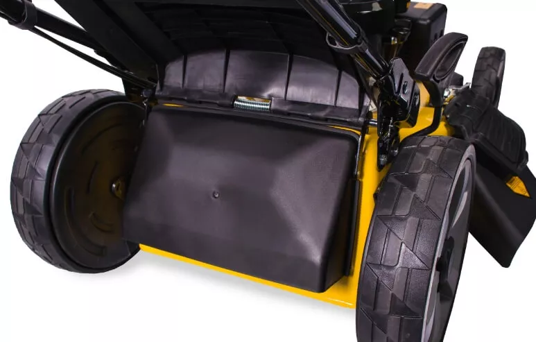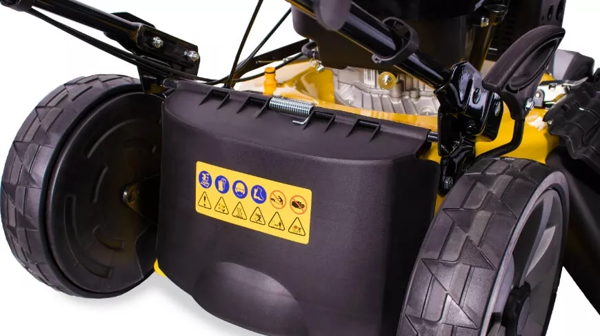 - Косилка комплектуется огромным комбинированным бункером для сбора травы, мульчирующей заглушкой и патрубком бокового выброса.