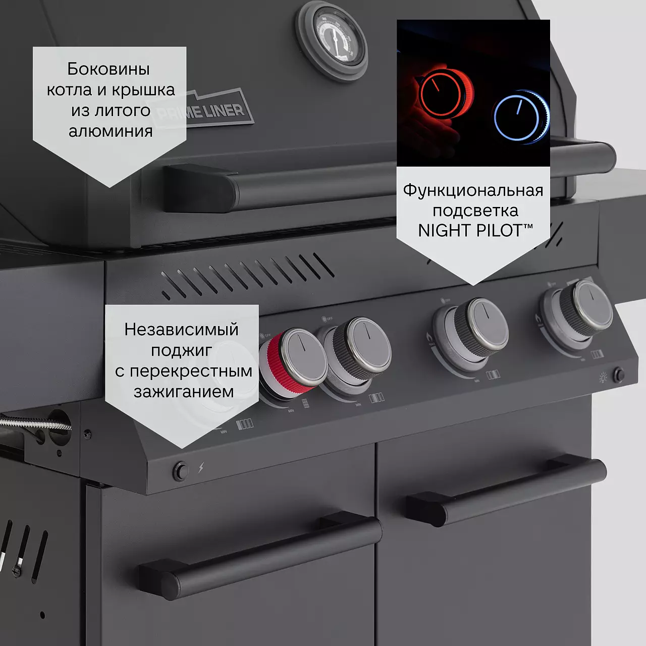 Новейшая система независимого пьезоподжига PRIME FIRE™️ с перекрестным зажиганием горелок и ручки с функциональной «ночной» подсветкой NIGHT PILOT™️.