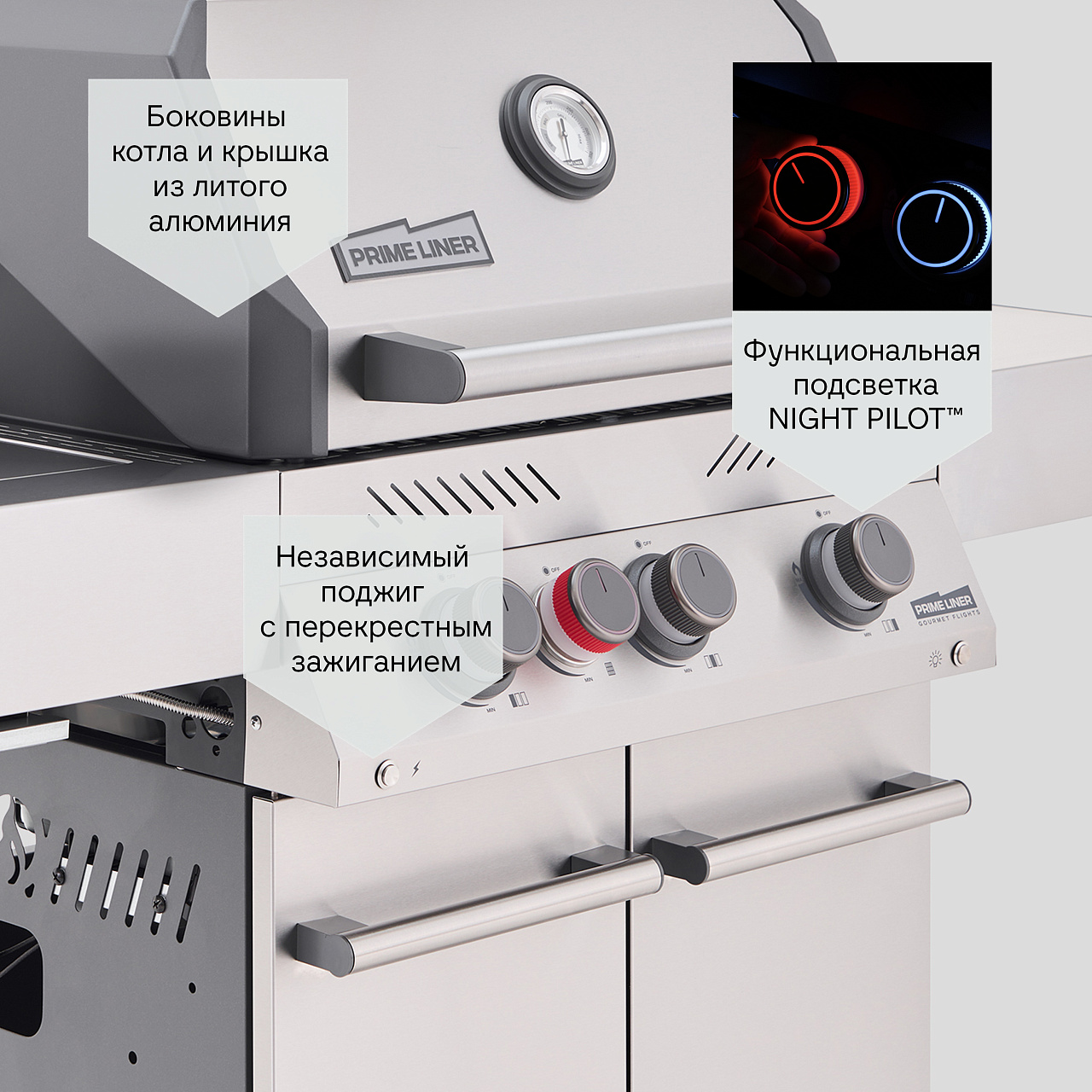 Новейшая система независимого пьезоподжига PRIME FIRE™ с перекрестным зажиганием горелок и ручки с функциональной «ночной» подсветкой NIGHT PILOT™.
