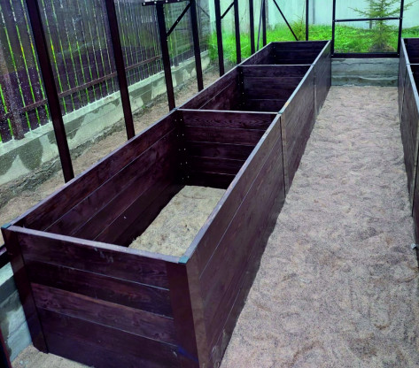 Грядки изготовлены из сибирской лиственницы путем соединения путем соединения полотен между собой при помощи технологии шип-паз.