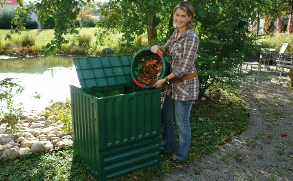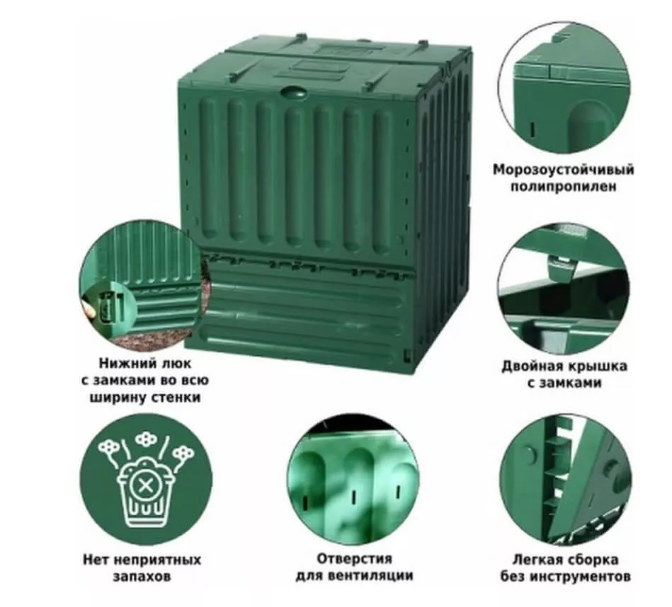 - Удобный компостер можно разместить в любом месте на садовом участке с целью производства удобрений.