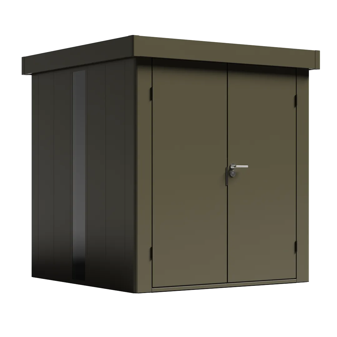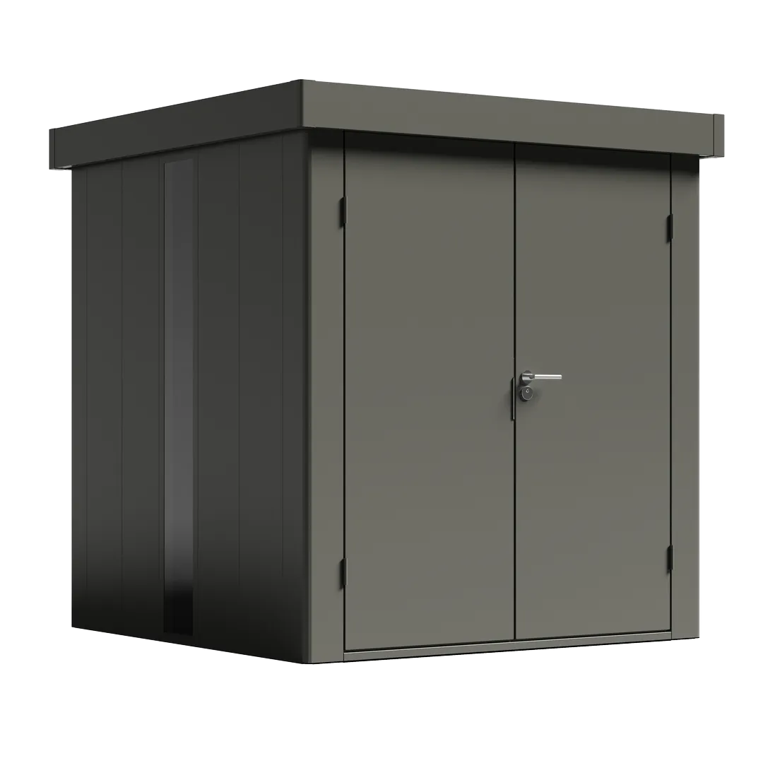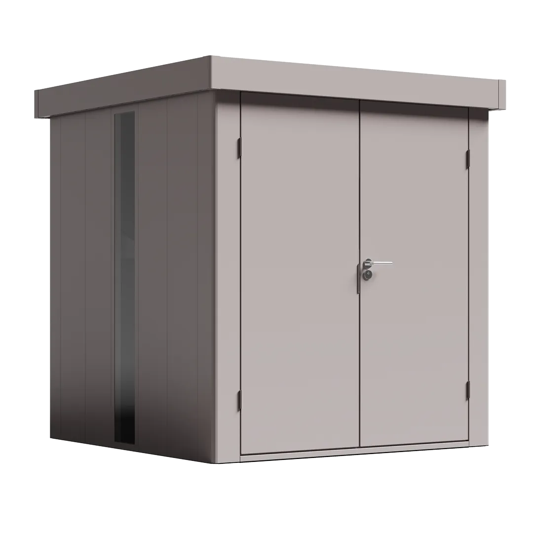 При необходимости вы можете дополнить стандартную версию сборного металлического сарая Neo необходимыми опциями: полками, панелями со стеклом, силовым основанием сарая и светодиодной подсветкой фасадов.