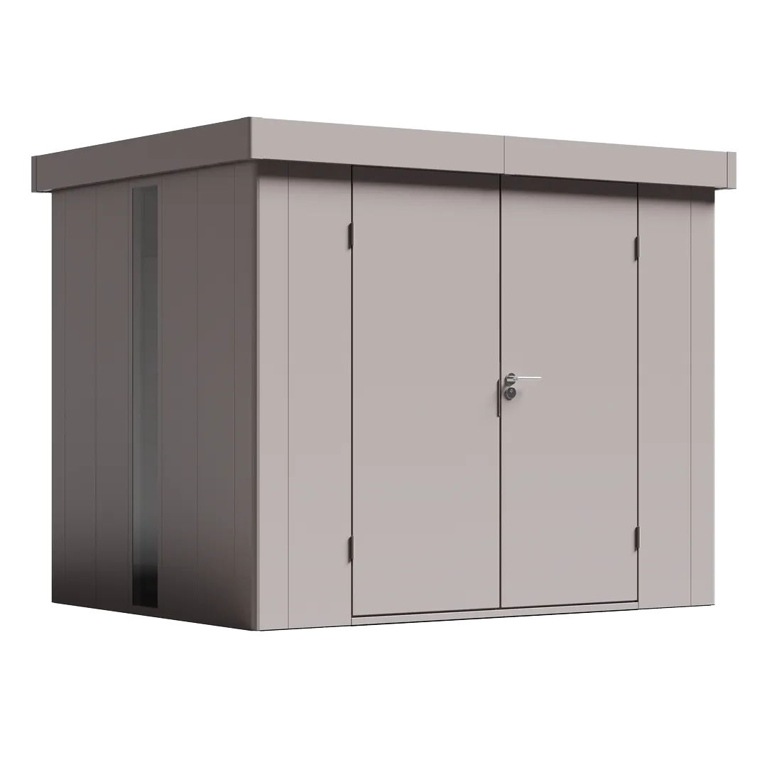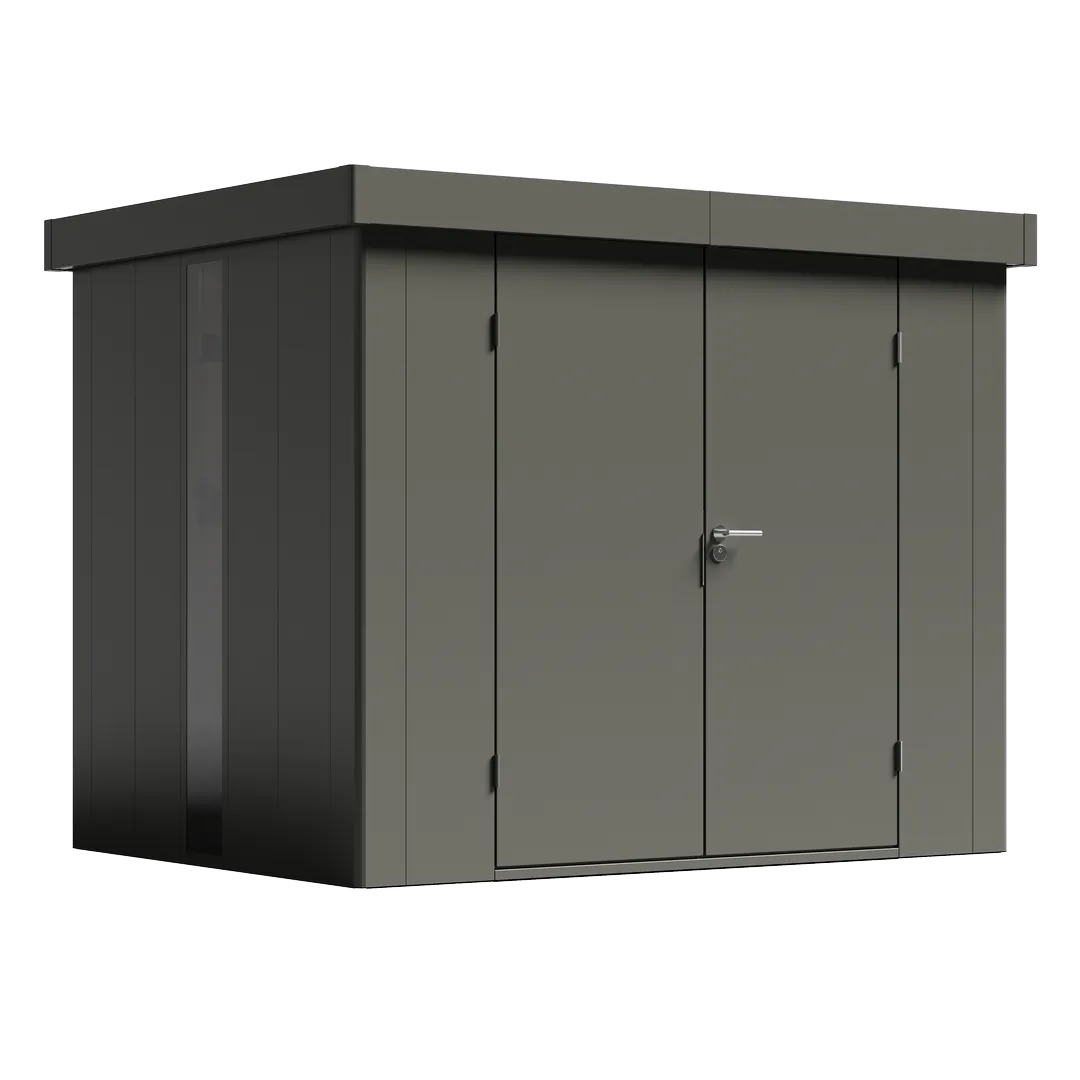 При необходимости вы можете дополнить стандартную версию сборного металлического сарая Neo необходимыми опциями: полками, панелями со стеклом, силовым основанием сарая и светодиодной подсветкой фасадов.