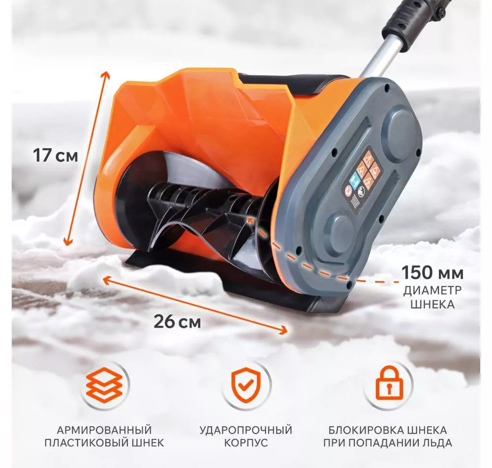Шнек прибора произведен из прочного пластика, безопасного для покрытий: тротуарная плитка или деревянные настилы остаются без повреждений. Благодаря такой конструкции работа получается эффективной и бережной для поверхности участка.