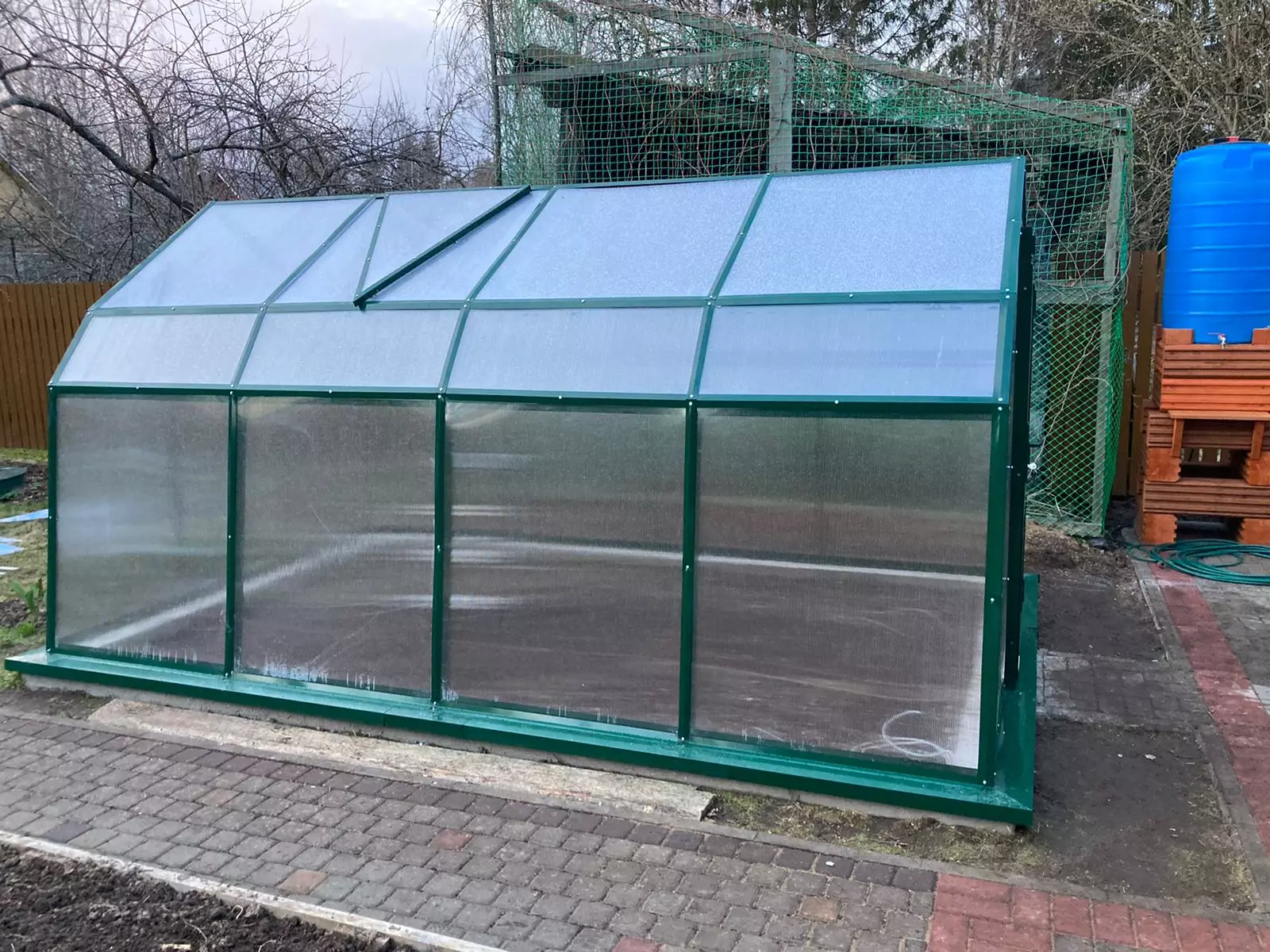 Длина модели варьируется от 2,05 до 11,05 м, что позволяет подобрать оптимальный вариант под размеры участка и объем будущих посадок. Теплица выдерживает снеговые нагрузки 180–220 кг/м² и ветер до 18–20 м/с, сохраняя стабильность в течение всего сезона.