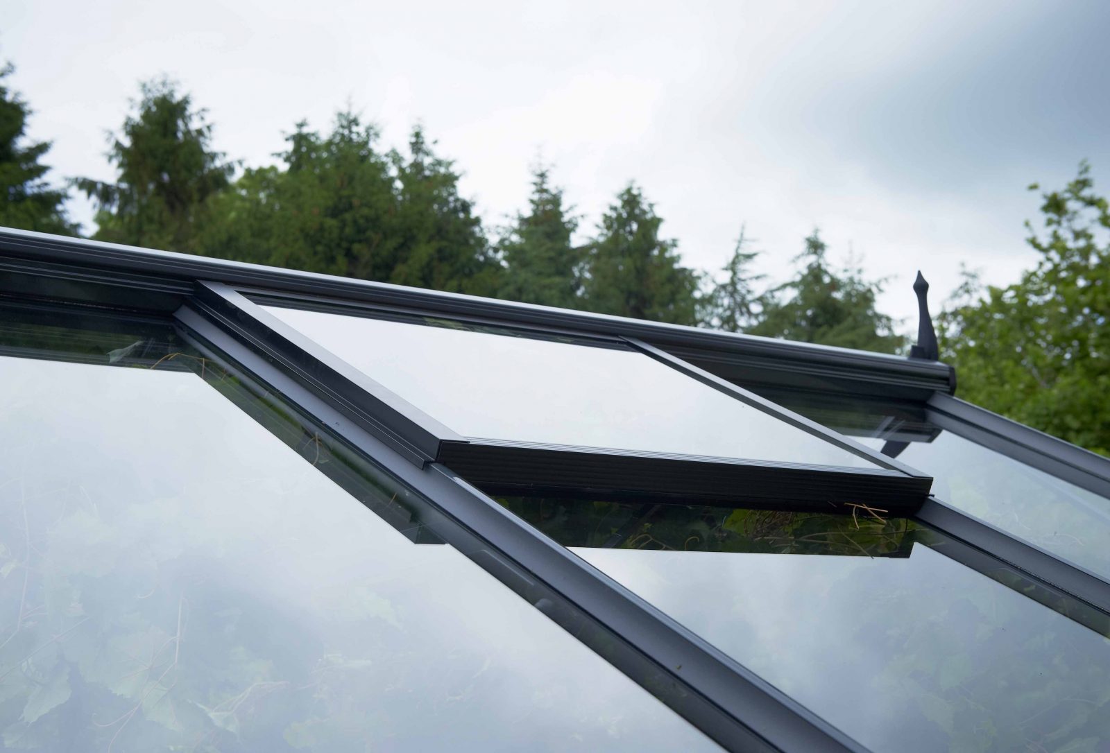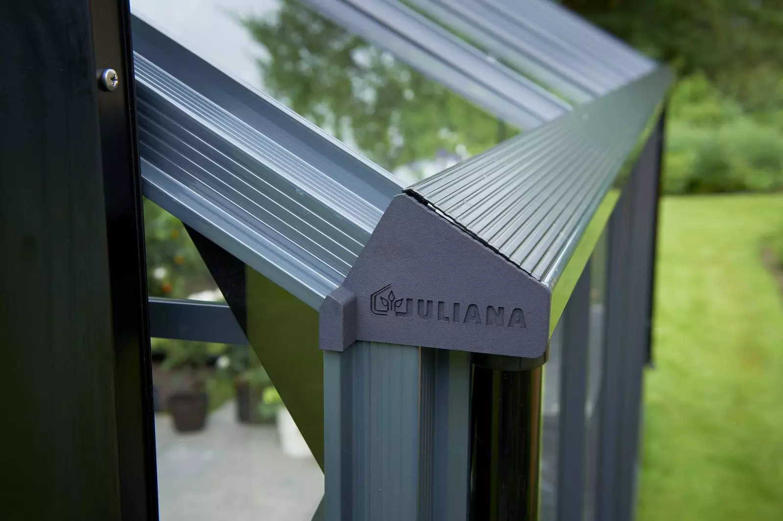 Особое внимание в теплице Juliana Gartner Anthracite уделено деталям: двери, форточки и элементы водосточной системы окрашены в глубокий чёрный цвет, который гармонично сочетается с антрацитовым тоном каркаса.