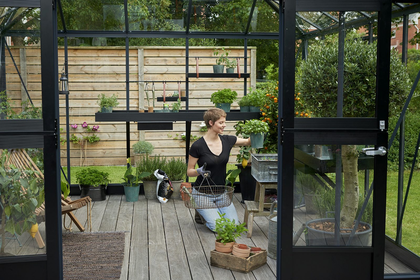 Изящная и функциональная теплица Juliana OASE 13,5 Anthracite создана для тех, кто ценит гармонию эстетики и практичности. Благодаря увеличенной высоте стен — 192 см — и четырёхскатной крыше, конструкция визуально напоминает стеклянный павильон, который становится не только рабочим пространством, но и украшением сада.