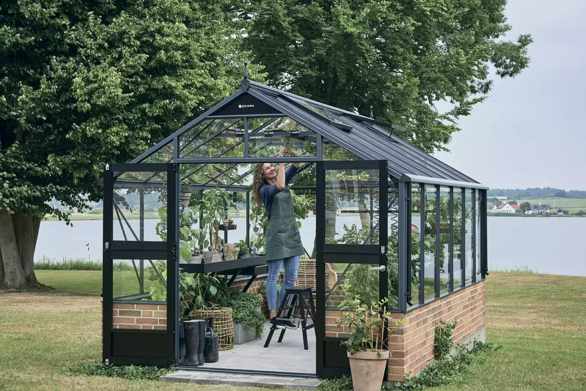Главная особенность модели — высокий цоколь, который добавляет конструкции визуальную завершённость. Каркас Juliana Premium выполнен из усиленного алюминиевого профиля, окрашенного в глубокий цвет антрацит методом порошкового напыления. Покрытие изготовлено из 4-миллиметрового закалённого стекла, обеспечивающего высокий уровень прочности и светопропускания. Увеличенная высота стен — 172 см — делает теплицу просторной и удобной для ухода за растениями.