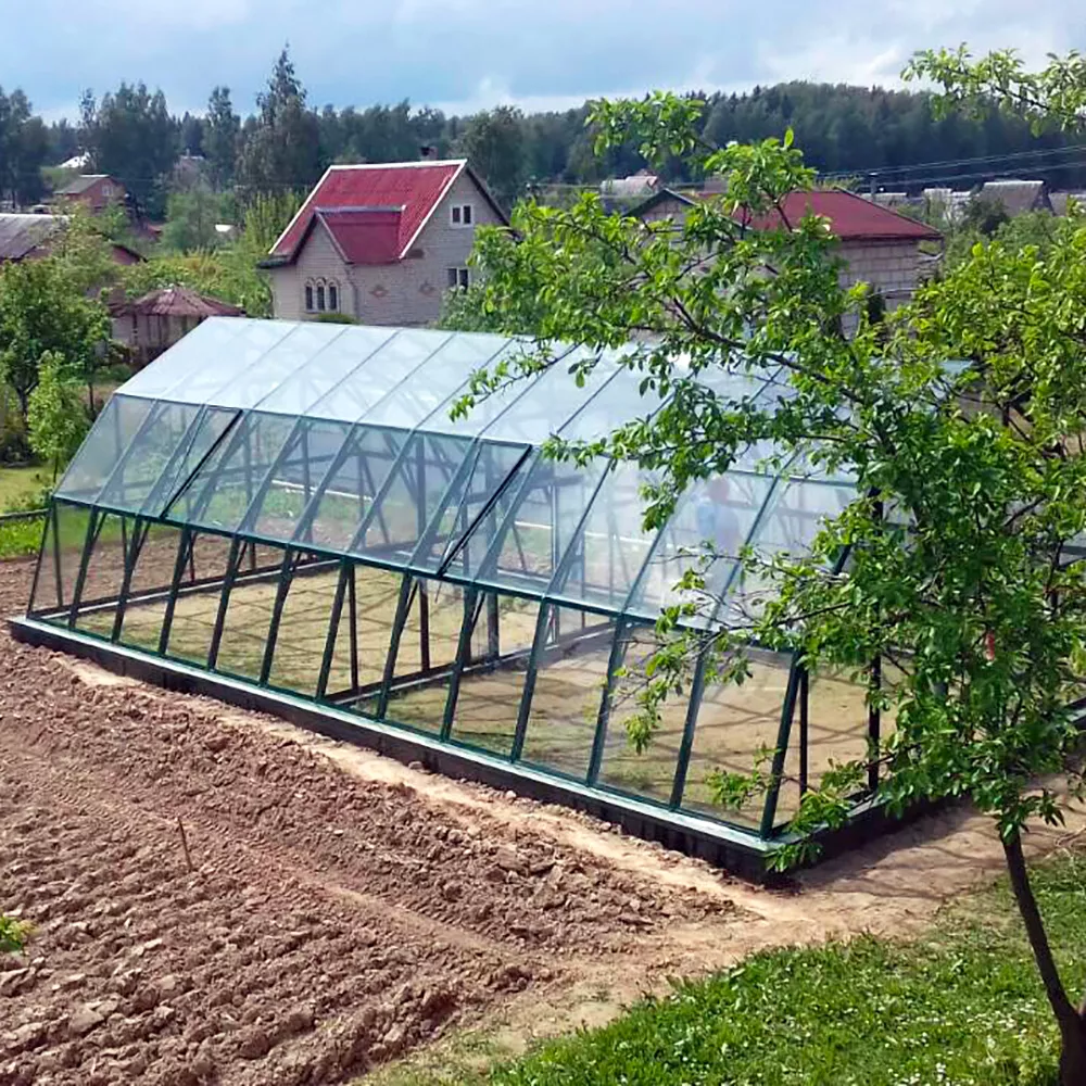 Прочный оцинкованный каркас способен выдерживать сильные ветровые и снеговые нагрузки до 20 м/с и 200 кг/м² соответственно, что позволяет эксплуатировать теплицу в различных климатических регионах. Доступны модификации длиной от 2,45 до 9,65 м, что позволяет подобрать конфигурацию под конкретный участок.