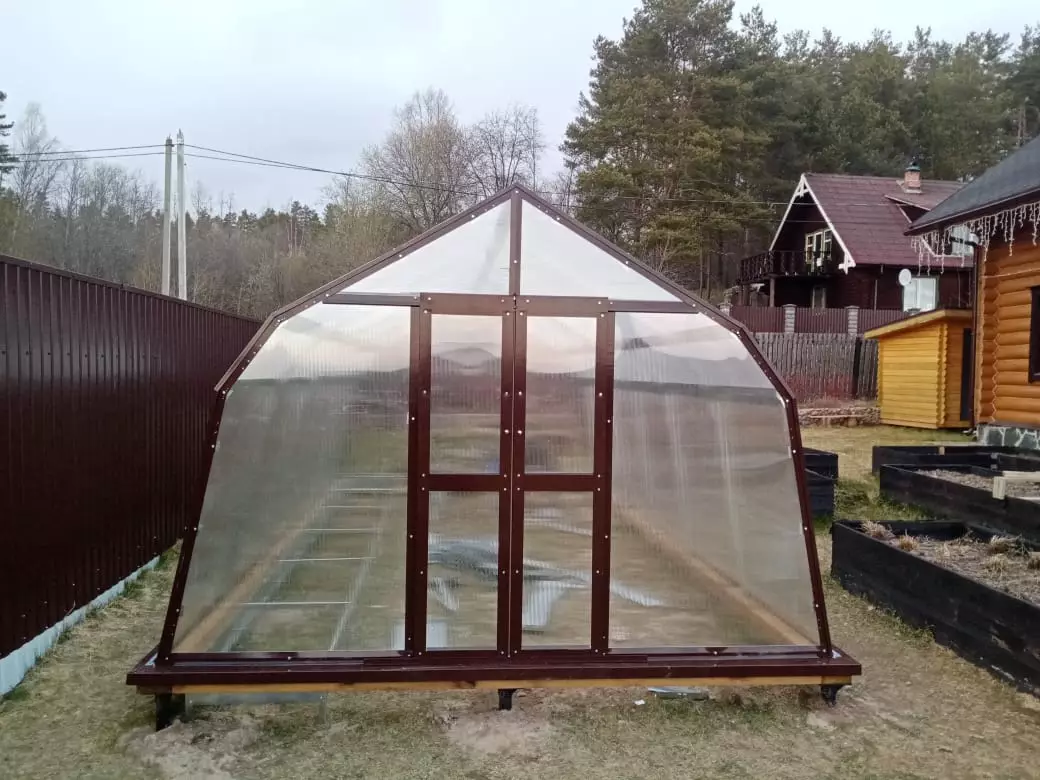 Основу модели составляет оцинкованный металлический каркас толщиной 1,5 мм, устойчивый к коррозии и рассчитанный на долгие годы эксплуатации. В качестве покрытия используется сотовый поликарбонат, обеспечивающий стабильную теплоизоляцию и защиту растений от перепадов температуры. Шаг секций 1 м равномерно распределяет нагрузку по всей конструкции, что позволяет уверенно выдерживать снеговые нагрузки 170–210 кг/м² и ветер до 18–20 м/с.