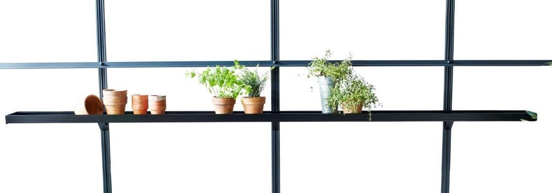 Полка для теплицы, модель 2014 года.Поставляется вместе с кронштейнами, легко монтируется на алюминиевый профиль. Полка выполнена в виде неглубокого поддона. На такой полке можно высаживать рассаду или использовать её как рабочий столик. Полки эффективно увеличивают полезную площадь вашей теплицы. Вариант отделки окраска в черный цвет.