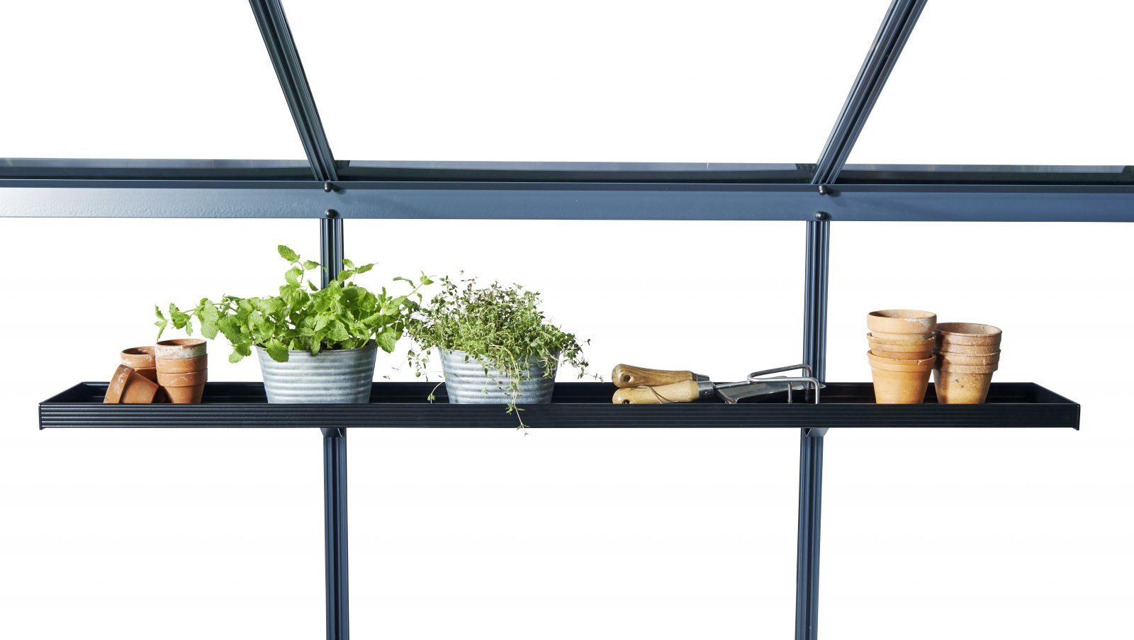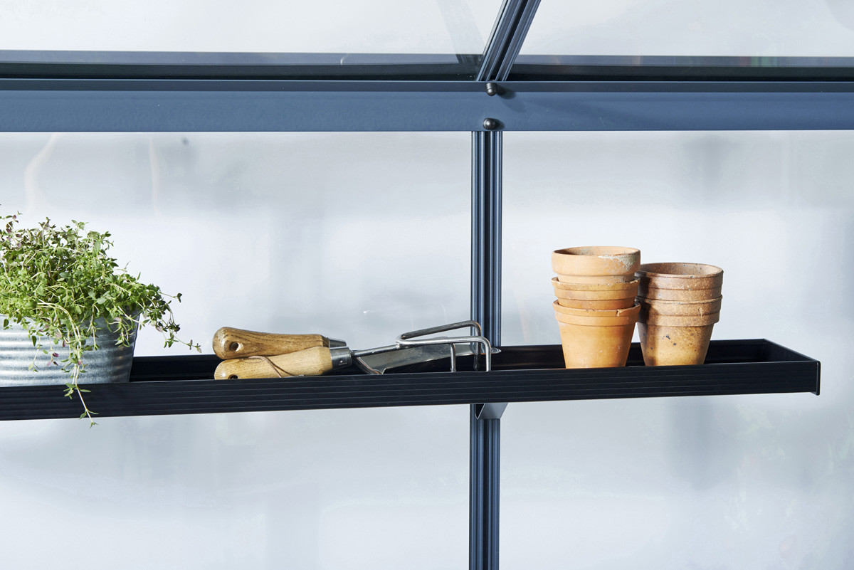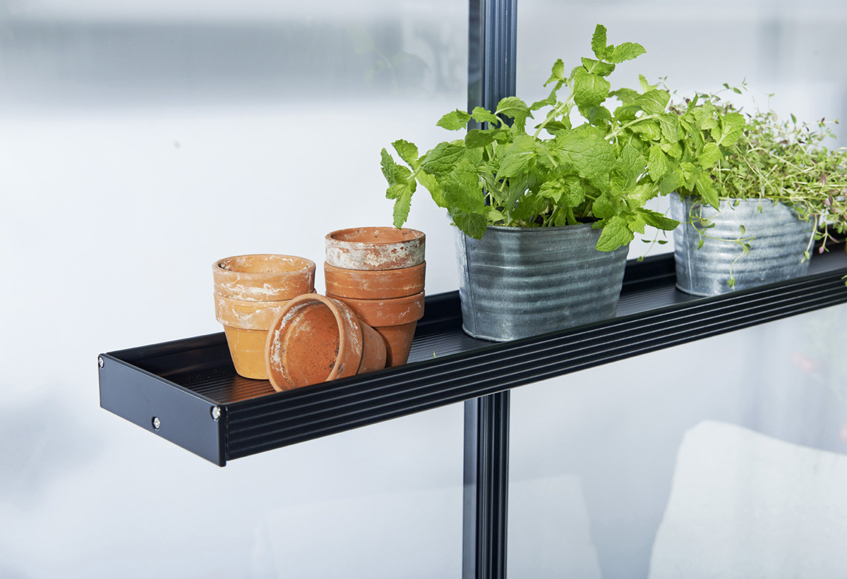 Полка для теплицы, модель 2014 года.Поставляется вместе с кронштейнами, легко монтируется на алюминиевый профиль. Полка выполнена в виде неглубокого поддона. На такой полке можно высаживать рассаду или использовать её как рабочий столик. Полки эффективно увеличивают полезную площадь вашей теплицы. Вариант отделки окраска в черный цвет.